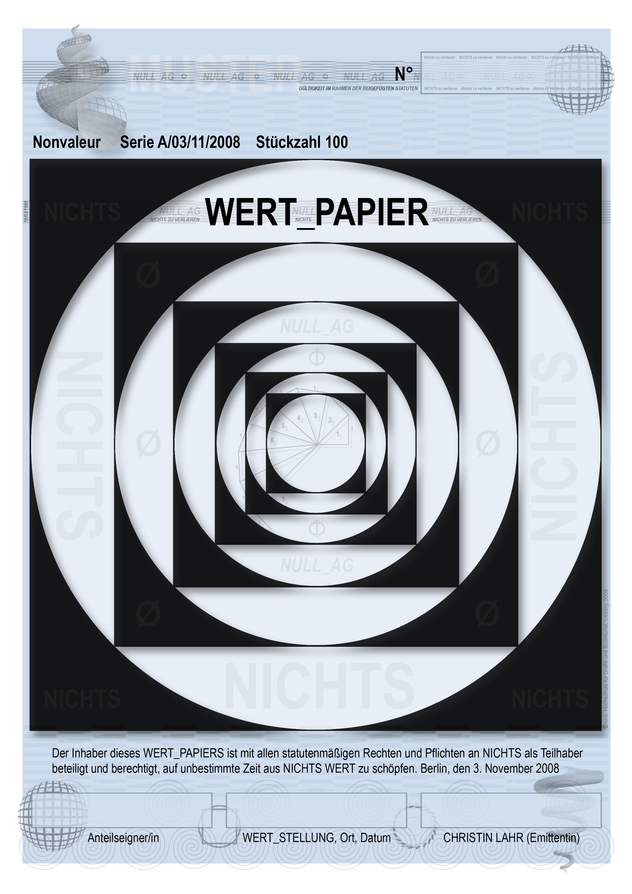 WERT_PAPIER, Nonvaleur Serie A/03/11/2008, 100 Stück; Zeichnung, Ausgabe durch Christopher Langer, Mitarbeiter der NULL-AG